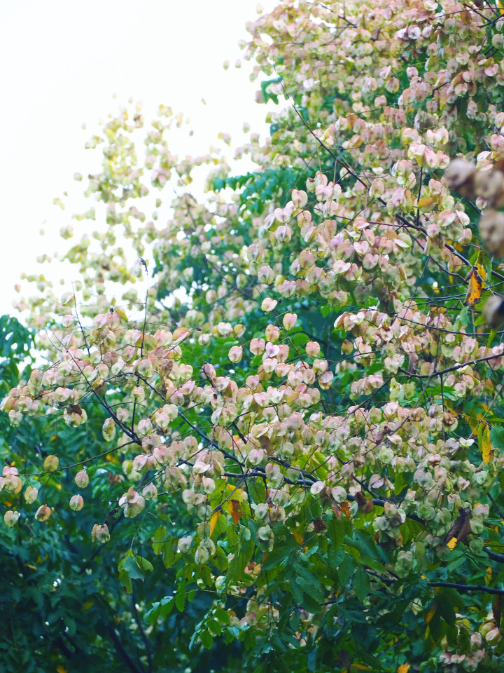 只是园中的栾树结果稀疏,颜色也淡,高高地悬在枝头,像一抹遥远的叹息。倒是路边那两棵生得正好,可惜车水马龙,终究不便久留。人生总要留些遗憾的,我想。
