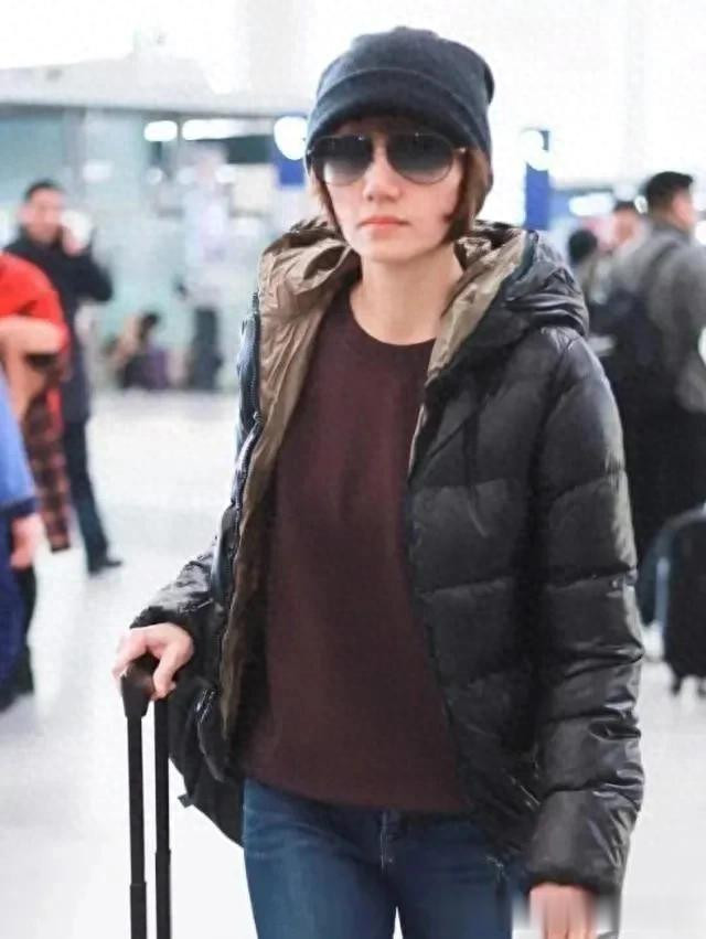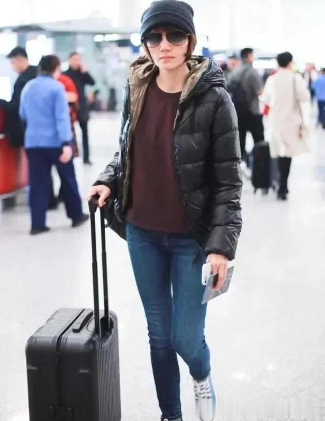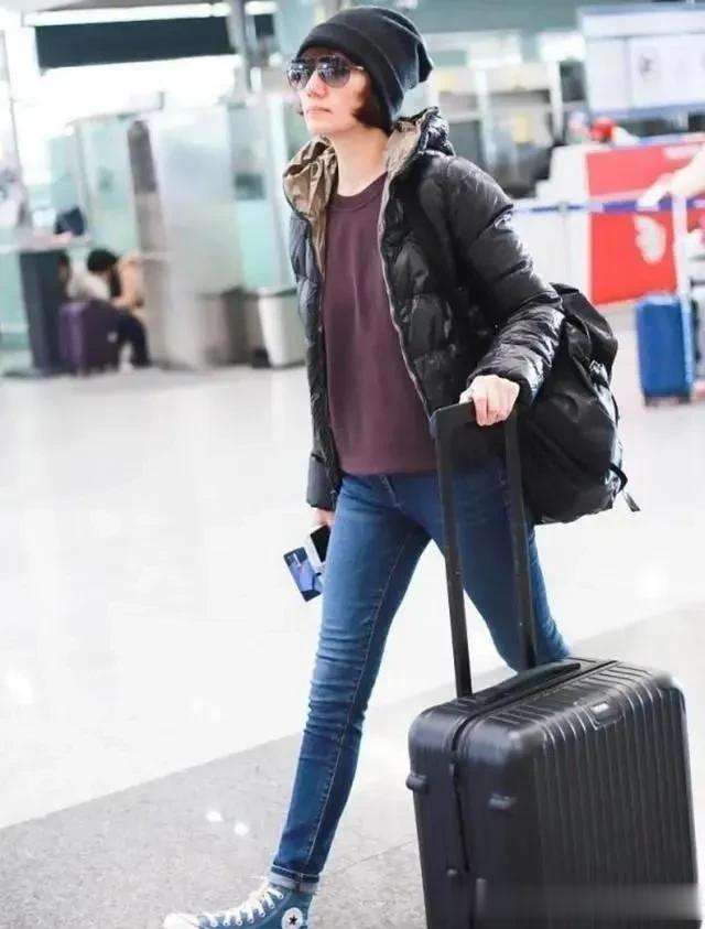 袁泉机场私服真时髦! 黑色羽绒服+牛仔裤+帆布鞋, 简约休闲又舒适