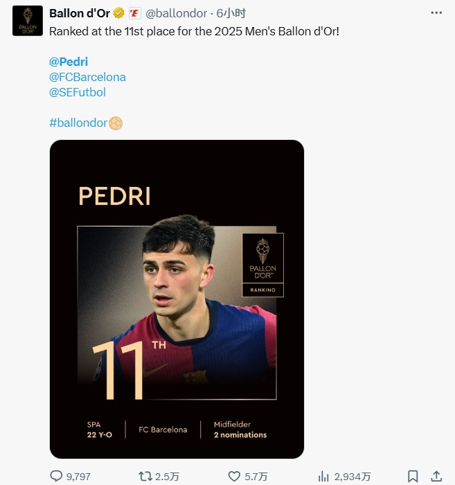 在金球奖官方发布的社媒下,佩德里排名11的阅读量接近3000万,回复近1万,点赞5.7万,转发2.5万。