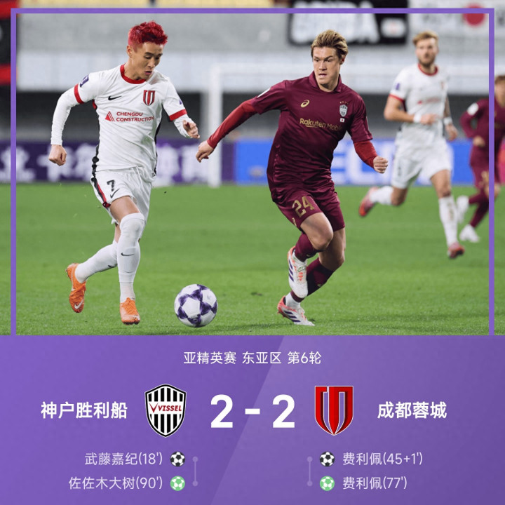 易边再战,成都蓉城率先实现反超。第65分钟,韦世豪左路弧线球传中,门前两点包抄均未能碰到,皮球中柱而出。第77分钟,韦世豪传中造点、费利佩主罚梅开二度,蓉城2-1反超。第90分钟,井手口阳介禁区内接球在李扬防守下倒地,主裁判罚点球,佐佐木大树点射命中,神户2-2。最终双方2-2握手言和。