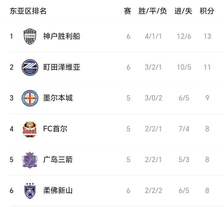 随着比赛结束,亚冠精英联赛最新积分榜如下